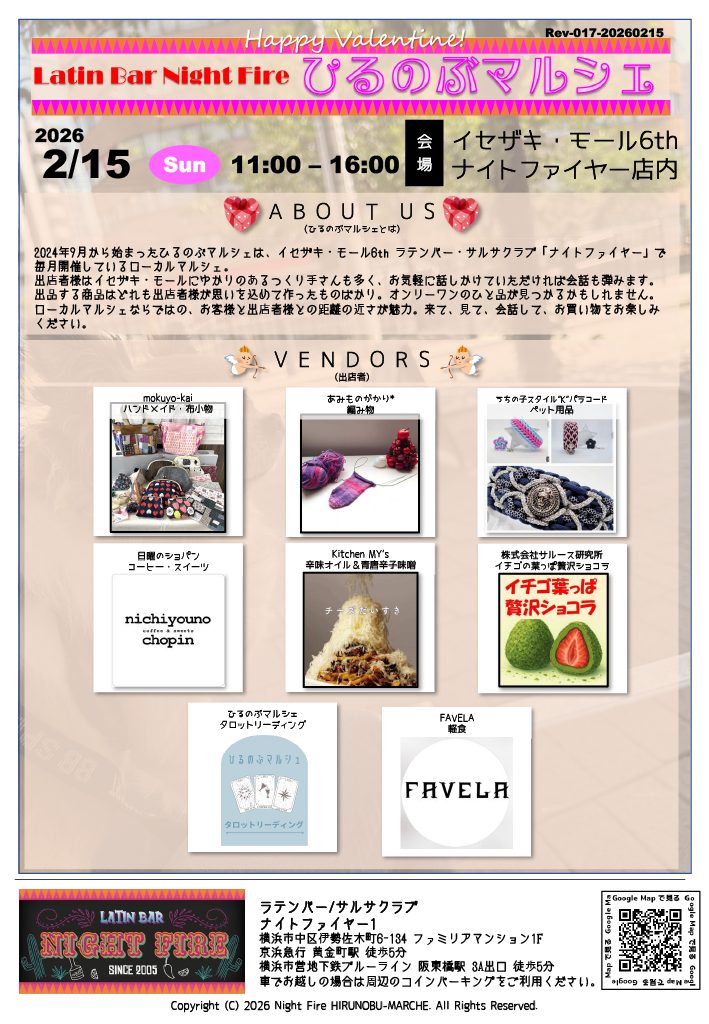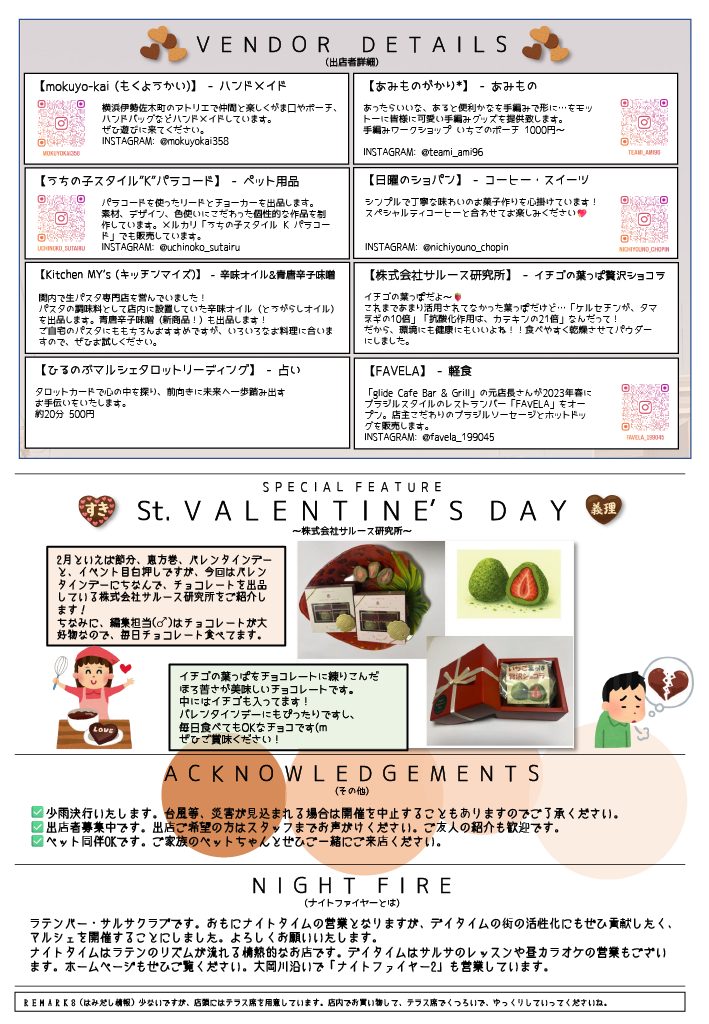 横浜・黄金町でマルシェに出店します【2月15日】 ニュース 2026.02.072026.01.09今まで未利用だったイチゴの葉っぱを使用したチョコレート菓子及び米粉麺の新商品を横浜・黄金町マルシェにて販売します。 今回のチラシは、バレンタイン特集です。【日時】 2026年2月15日 日曜日 11時~16時【場所】 ラテンバー/サルサクラブ ナイトファイヤー1横浜市中区伊勢佐木町6-134 ファミリアマンション1F京浜急行黄金町駅徒歩5分横浜市営地下鉄ブルーライン阪東橋駅3A出口 徒歩5分